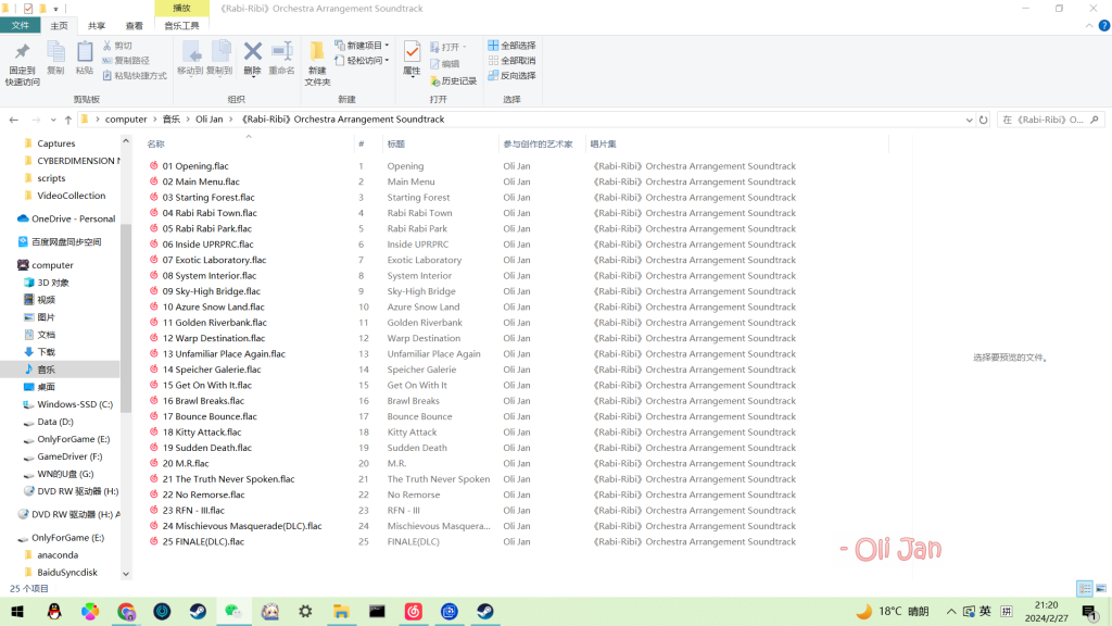 光盘和外置光驱一到,就把OST翻录到了本地,从此实体光盘被我作为传家宝雪藏。还是怕光盘经常拿出来容易刮花啥的。 言归正传,一共25首OST,全部用windows player翻录成了flac格式的文件。主要是flac貌似是无损的,所以才选的flac。 不得不说《Rabi Ribi》的OST质量都很不错,特别是交响乐版的。像图书馆的OST”Speicher Galerie”至今都是我的消息铃声和起床铃。 《Rabi ribi》交响乐翻录 本站只提供攻略指南介绍,如需游玩可前往⬇︎⬇︎⬇︎