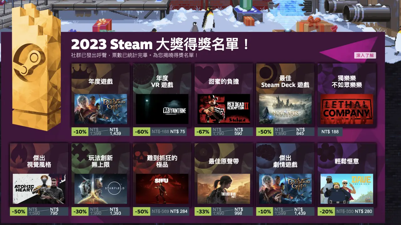 Steam 于 2023 年底发起的冬季特卖活动与游戏年度大奖经票选活动,经过统计后,票选结果出炉,以下列出所有2023年Steam 大奖的入围名单与得主。